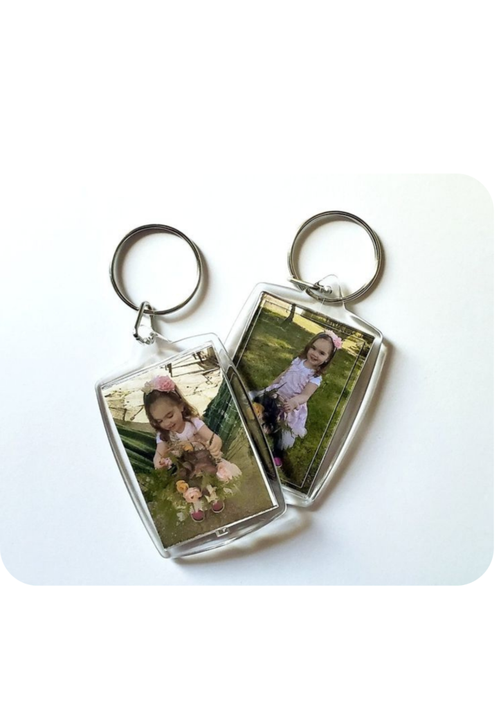 Case keychain berbahan akrilik, dengan ukuran 4x5,5 cm dan photo dicetak UV.