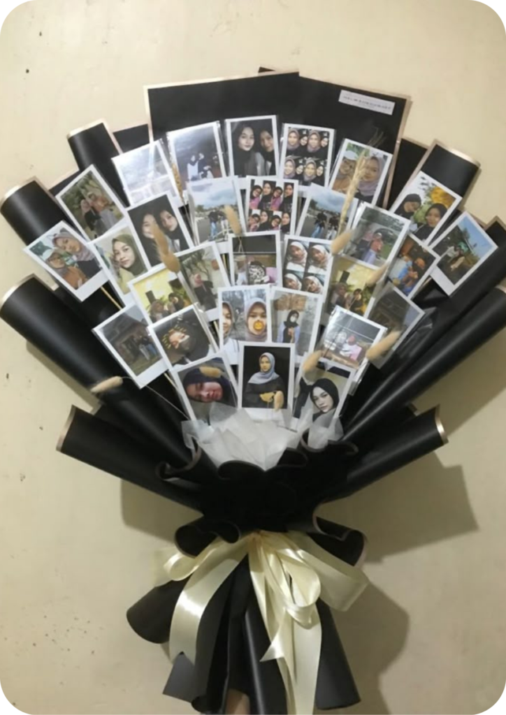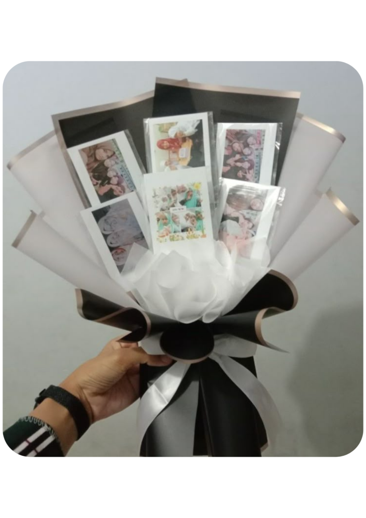 Paket buket ukuran 40x20 cm, berisi 30 foto dengan ukuran 2r, dan bebas pilih warna wrap.